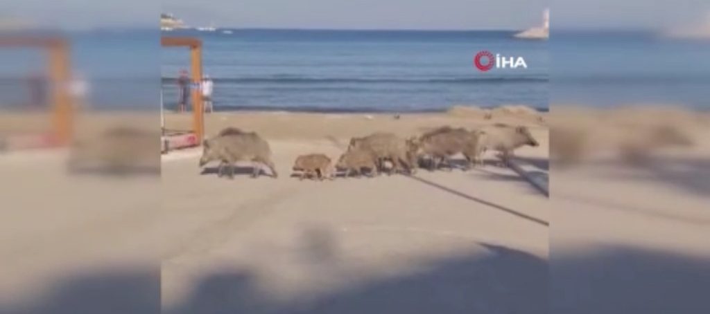 Kuşadası Halk Plajı’nda güneşlenen ve denize giren yabancı turistler, bir anda karşılarında beliren domuz sürüsüyle neye uğradıklarını şaşırdı. Hiçbir şey yokmuş gibi sahili turlayan yaban domuzları, yiyecek arayışı içinde plajda dolaşmaya başladı. Bu sıra dışı manzarayı gören meraklı turistler, telefonlarına sarılarak fotoğraf ve video çekti. Domuzların ormanlık alanlardan yiyecek bulmak amacıyla sahile indiği belirtildi.