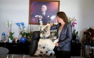 Çeşme Belediye Başkanı Lal Denizli, köpeklerin toplatılıp uyutulması gündemdeyken, makam koltuğuna köpek oturttu.