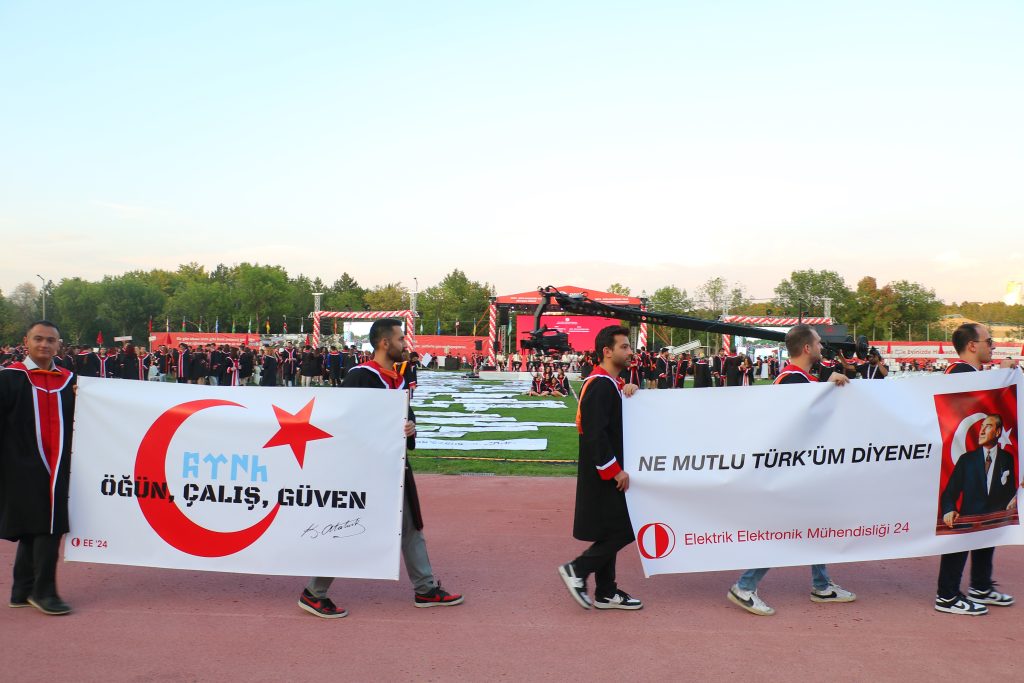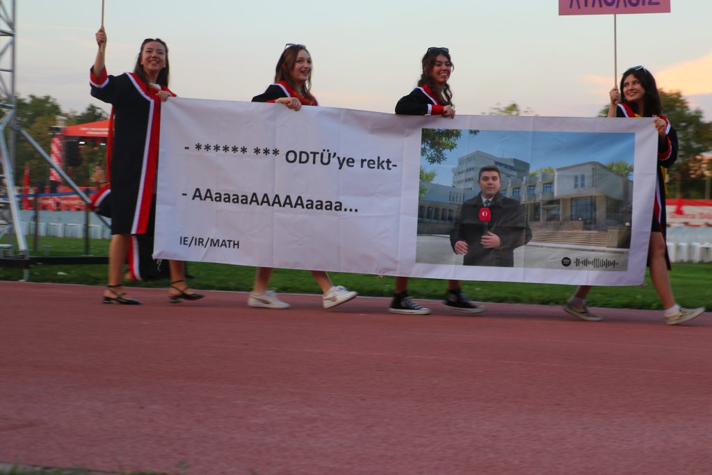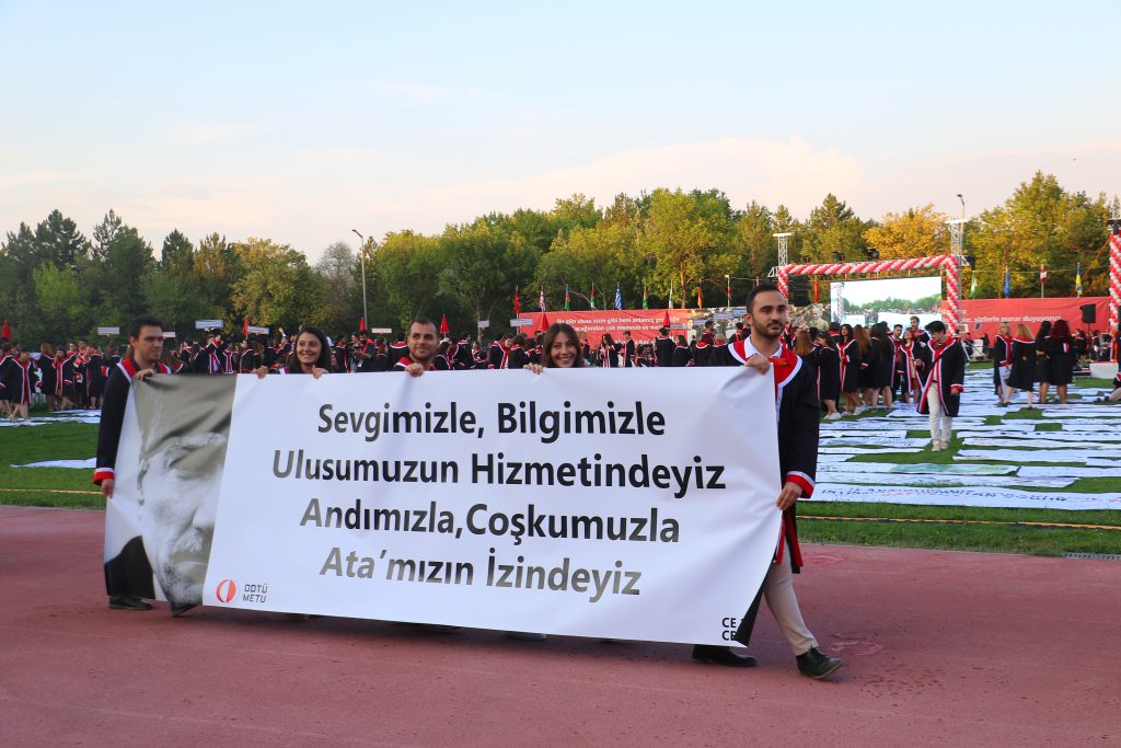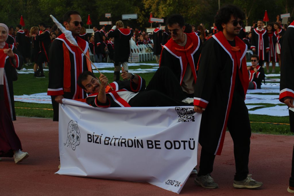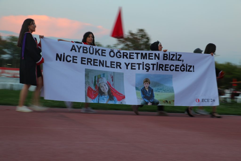 ODTÜ’nün 2023-2024 eğitim öğretim yılı mezuniyet töreni, ODTÜ Devrim Stadyumu’nda gerçekleştirildi. Her sene geleneksel olarak ODTÜ Stadyumu’nda düzenlenen toplu mezuniyet töreni saat 18.00’da başladı. Öğrencilerin açtığı pankartlar, güvenlik kontrolünden geçerek stada kabul edildi. Bando eşliğinde çalınan marşlarla başlayan tören, öğrencilerin cübbeleriyle pankart açarak gerçekleştirdikleri kortejle devam etti. Renkli görüntülerin de yaşandığı kortej anı, Kadir Yavuz’un Moleküler Biyoloji ve Genetik Bölümü mezunu Eda Almeriç’e yaptığı evlilik teklifine sahne oldu. Kortejde şehit öğretmen Şenay Aybüke Yalçın doğum günü de öğrenciler tarafından unutulmadı. Eğitim Fakültesi öğrencileri tarafından Aybüke Öğretmen pankartları açıldı.