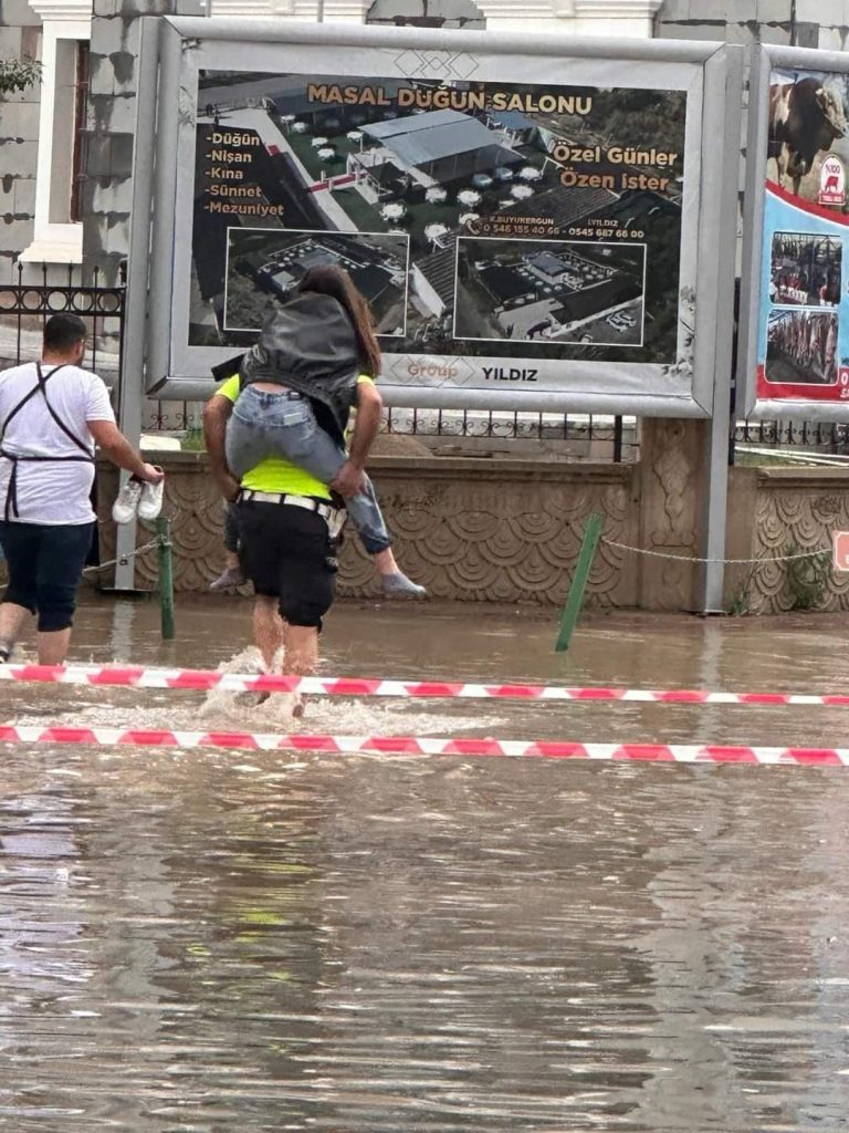 Yozgat’ın Yerköy ilçesinde akşam saatlerinde etkili olan sel nedeniyle ilçede görev yapan bir trafik polisi, sel sularıyla kaplı yolda bir vatandaşı sırtına alarak güvenli alana geçirirken bir diğer polis memuru ise selde mahsur kalan aracı iterek trafiğin açılmasına yardımcı oldu.
