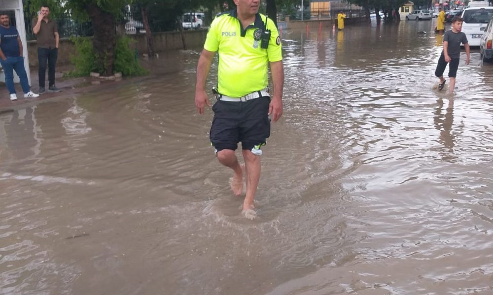 Yozgat’ın Yerköy ilçesinde akşam saatlerinde etkili olan sel nedeniyle ilçede görev yapan bir trafik polisi, sel sularıyla kaplı yolda bir vatandaşı sırtına alarak güvenli alana geçirirken...